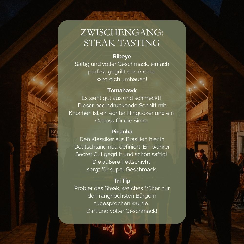 Beim „Beef Meats You“-Event erlebst du Rindfleisch nicht nur auf dem Teller – sondern direkt am Ursprung. Auf dem Kolping Hof erwartet dich ein Nachmittag voller Geschmack, Begegnung und kulinarischer Einblicke. Nach der Begrüßung mit einem kleinen Eierlikörchen genießt du ein exklusives 5-Gänge-Menü, begleitet von einem erfahrenen Fleischsommelier. Im Mittelpunkt: eine spannende Querverkostung verschiedener Cuts vom Bullen – direkt vom Hof. An der offenen Grillstation kannst du selbst mitwirken oder einfach zuschauen – ganz wie du willst. Und weil Genuss kein Wetter kennt, geht es bei Regen einfach im gemütlichen Innenbereich weiter.