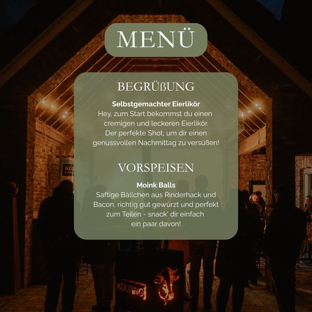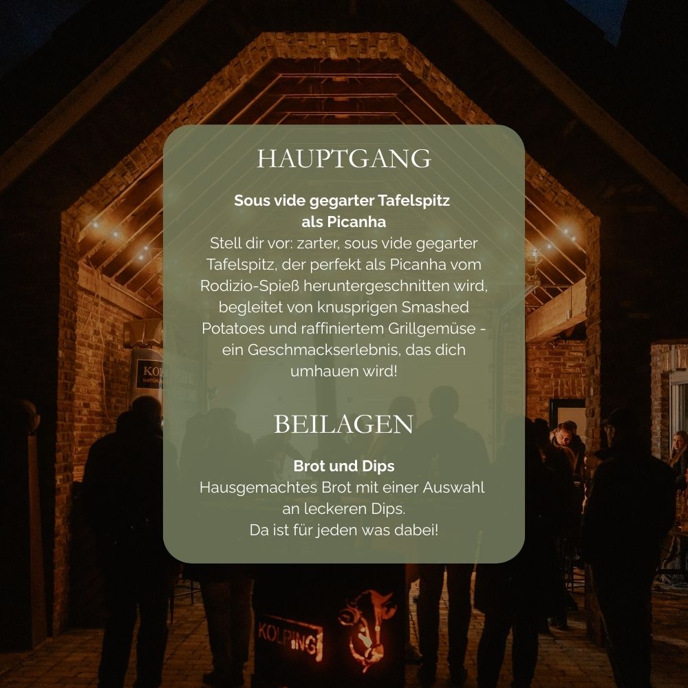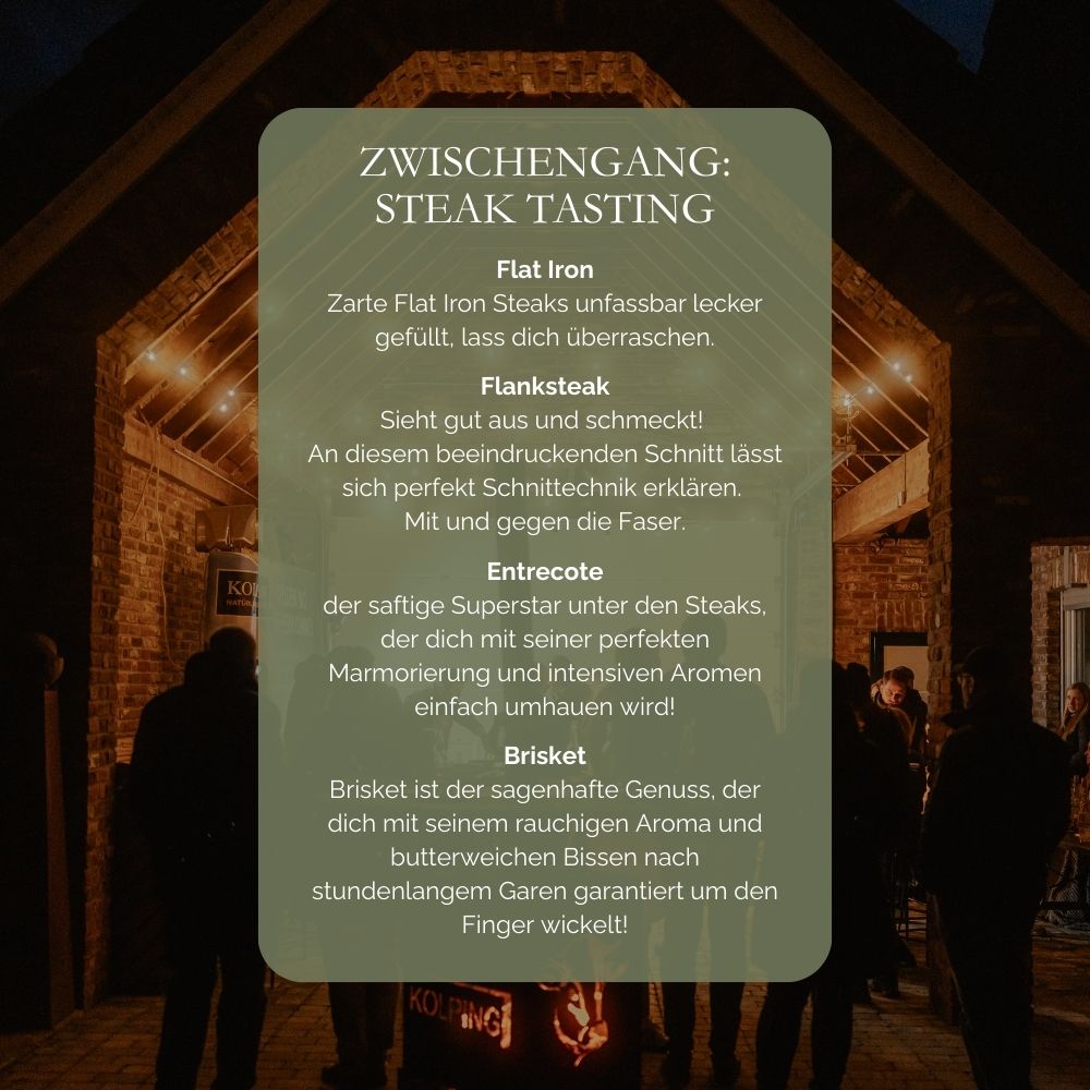 Beim „Beef Meats You“-Event erlebst du Rindfleisch nicht nur auf dem Teller – sondern direkt am Ursprung. Auf dem Kolping Hof erwartet dich ein Nachmittag voller Geschmack, Begegnung und kulinarischer Einblicke. Nach der Begrüßung mit einem kleinen Eierlikörchen genießt du ein exklusives 5-Gänge-Menü, begleitet von einem erfahrenen Fleischsommelier. Im Mittelpunkt: eine spannende Querverkostung verschiedener Cuts vom Bullen – direkt vom Hof. An der offenen Grillstation kannst du selbst mitwirken oder einfach zuschauen – ganz wie du willst. Und weil Genuss kein Wetter kennt, geht es bei Regen einfach im gemütlichen Innenbereich weiter.