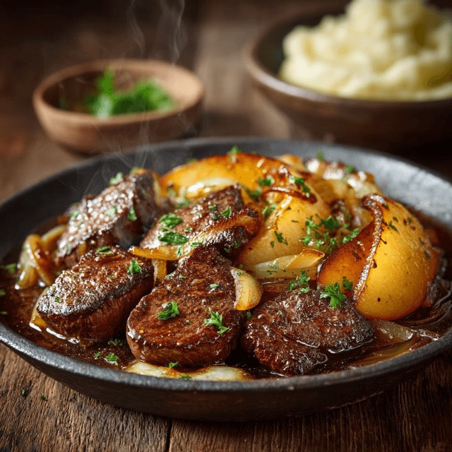 GEBRATENE BULLEN LEBER MIT APFEL-ZWIEBEL-GEMÜSE