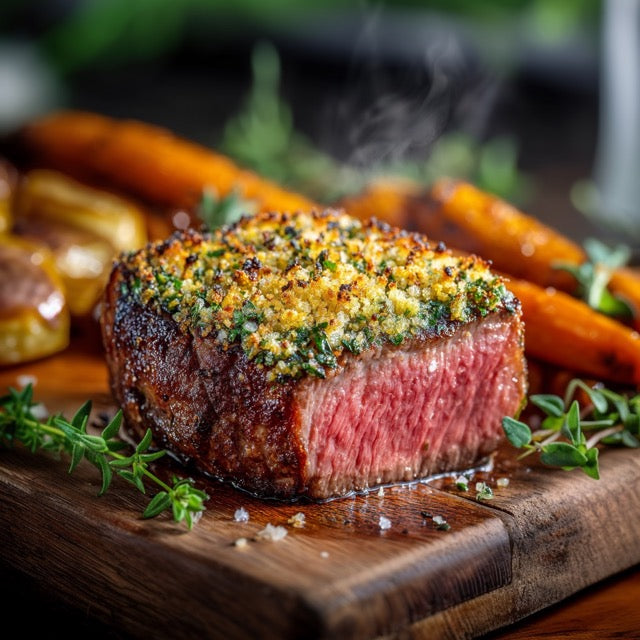 HÜFTSTEAK MIT KRÄUTER-SALSA & OFENKAROTTEN